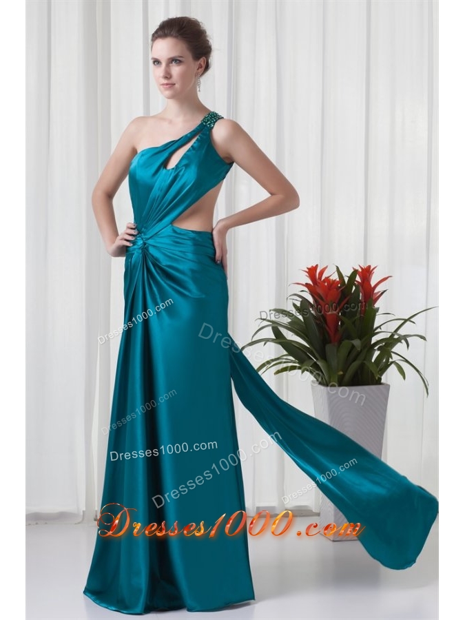 Teal One Shoulder Elastic Woven Satin Prom Dress with Cross Cross
