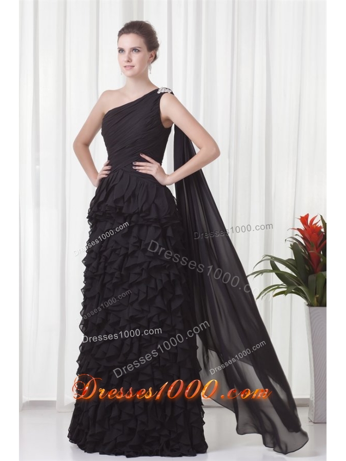 Black One Shoulder Ruffled Prom Party Dress with Watteau Train