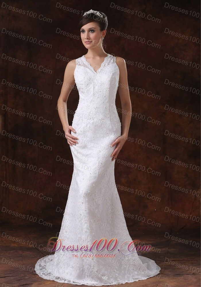 V Neck Mermaid Sweep Wedding Dress Lace For Brides