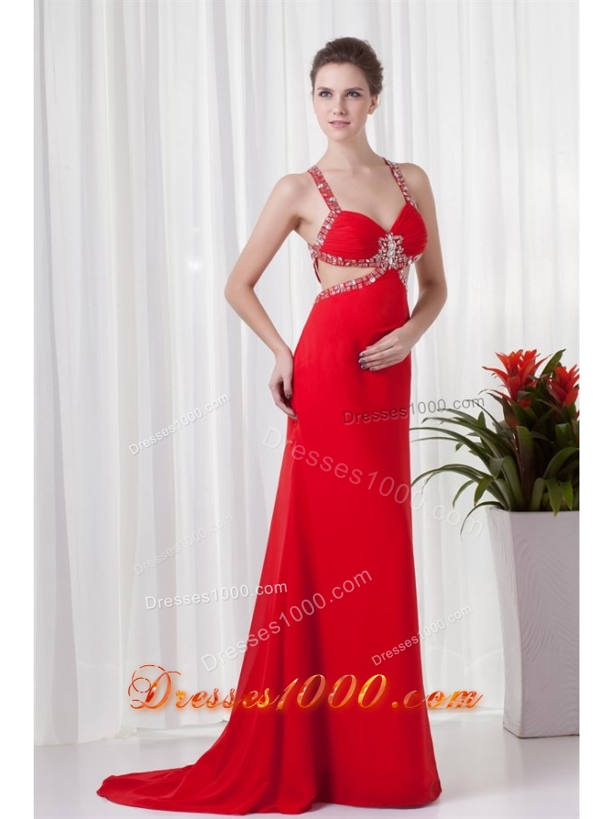 Red Column Straps Brush Train Prom Dress with Cross Cross