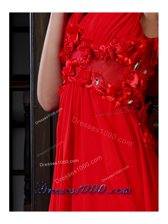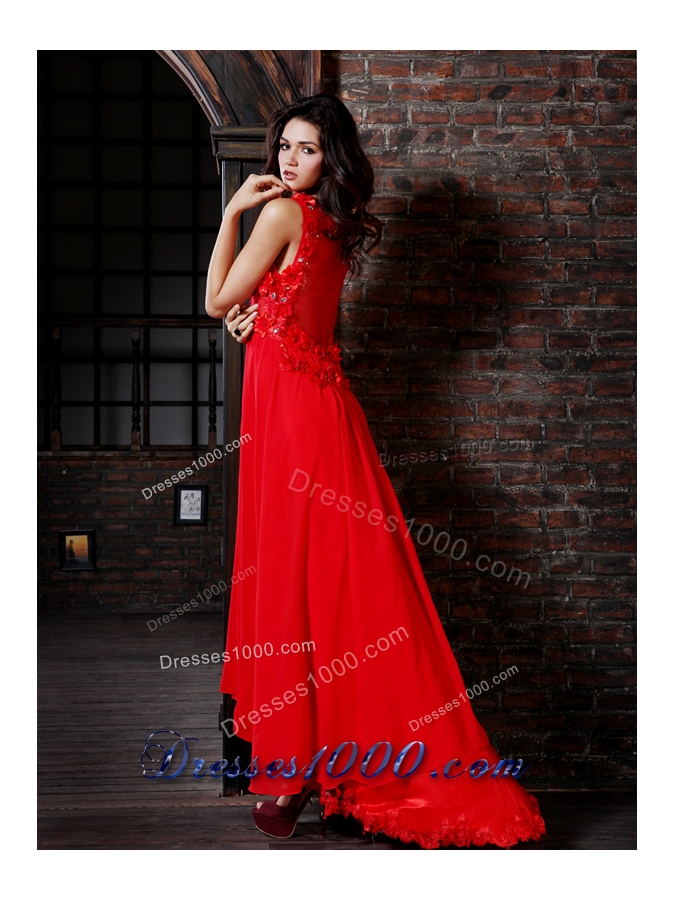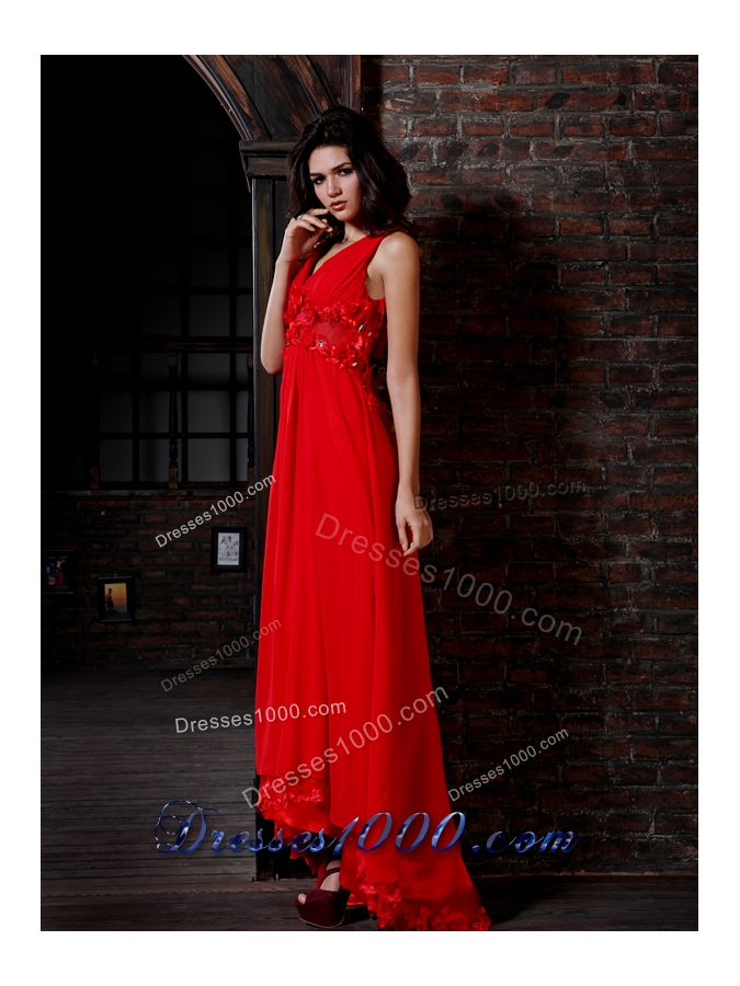 Bright Red V-neck Chiffon High Low Prom Dress with Flowers