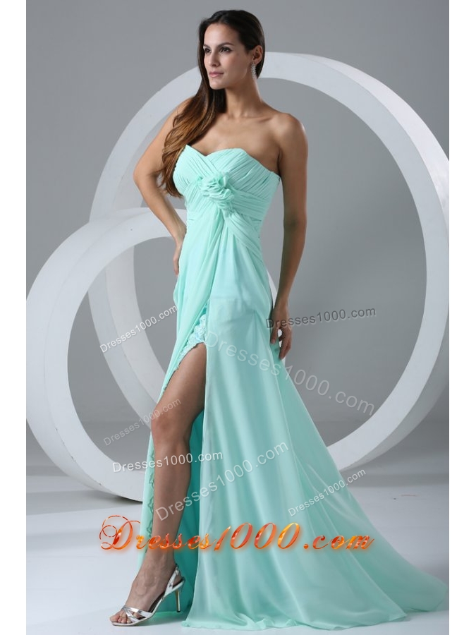 Aqua High Slit Sexy Prom Dress with Flowers and Ruching