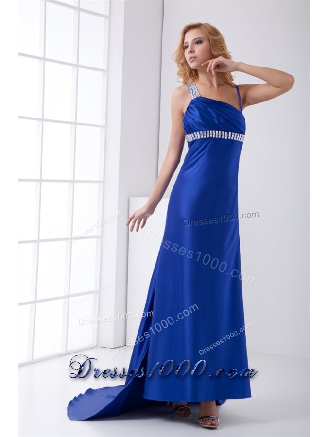 Perfect Backless Blue Column Prom Gown with Brush Train and Beading