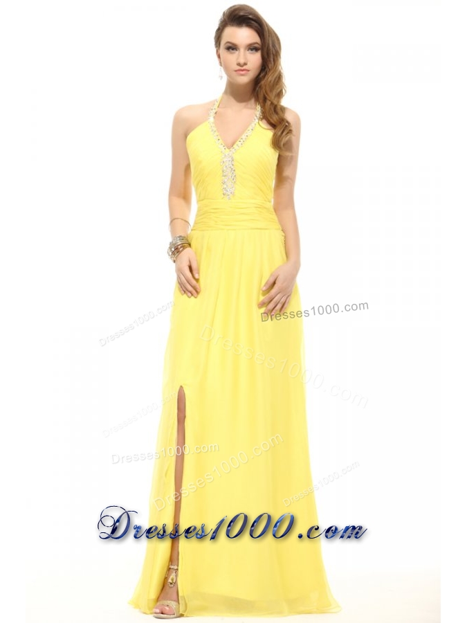 Empire Light Yellow Halter Top Beading Chiffon Prom Dress with Slit
