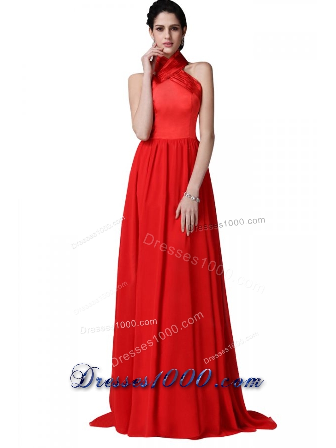 2014 Most Popular Red Halter Top Chiffon Prom Dresses with Ruching