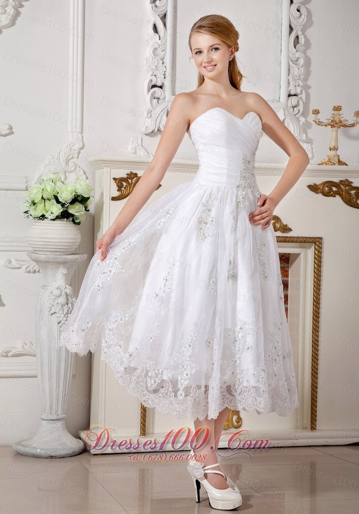 This special tea-length dress is so charming that never a style come close to it. It has a lovely strapless sweetheart bodice which is decorated with beautiful appliques and beadings. The lace overlaid the skirt which is also embellished with scattered appliques make you look more gorgeous. The fabric-covered buttons above the hidden zipper closure gives the back a completing looking.