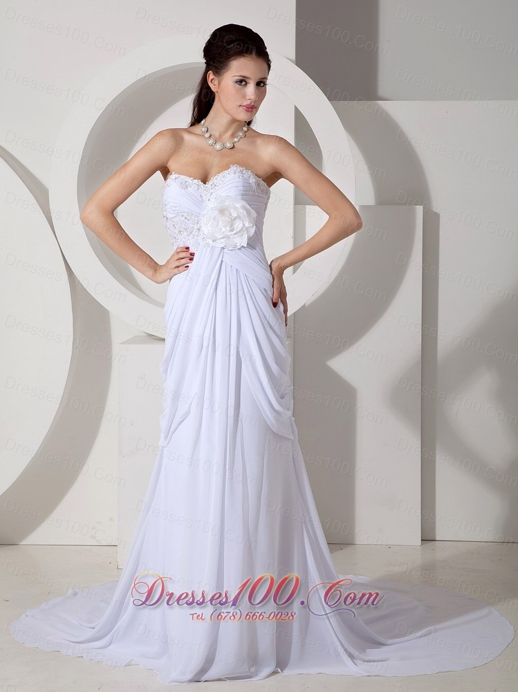 Ruched Appliques Flowers Wedding Dress Chiffon Train