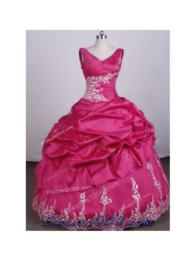 Fashionable Ball Gown V-Neck Floo_length Appliques Tffeta Hot Pink Quinceanera Dresses