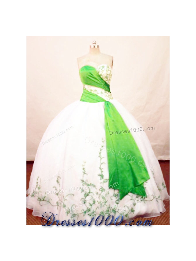 The bodice with a sweerheart neckline, characterized by green in contrast with white,will help you to earn thousands of spotlight at the party.The embroidery on the puffy skirt demonstrastes the elegance.