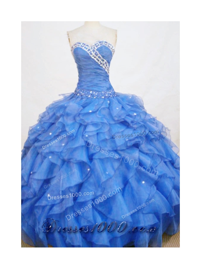 When it comes to blue allure, you can't do better than this strapless ball gown.Gorgeous, iridescent ruffles crowd along its flared, floor-length skirt.Brilliantly shimmering beads encrust its waistline and run up to its sweetheart neckline.