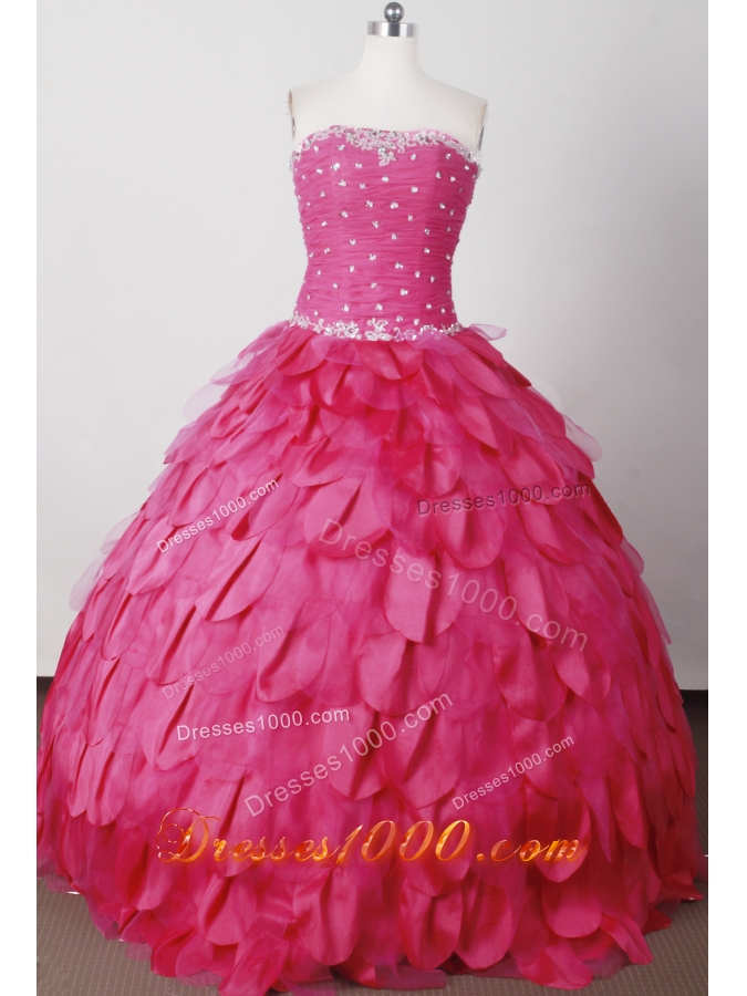 Strapless bodice is completely adorned with stunning beading.The waist shows off curves to create a slender figure.Layered big petals over ball gown skirt is dramatic.