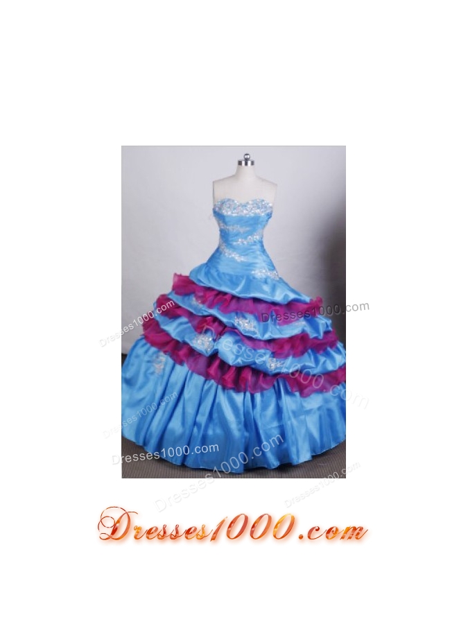 Pretty ball gown sweetheart floor-length quinceanera dress adorned by appliques and beading. Two layers of differrent color makes the dress more attractive.