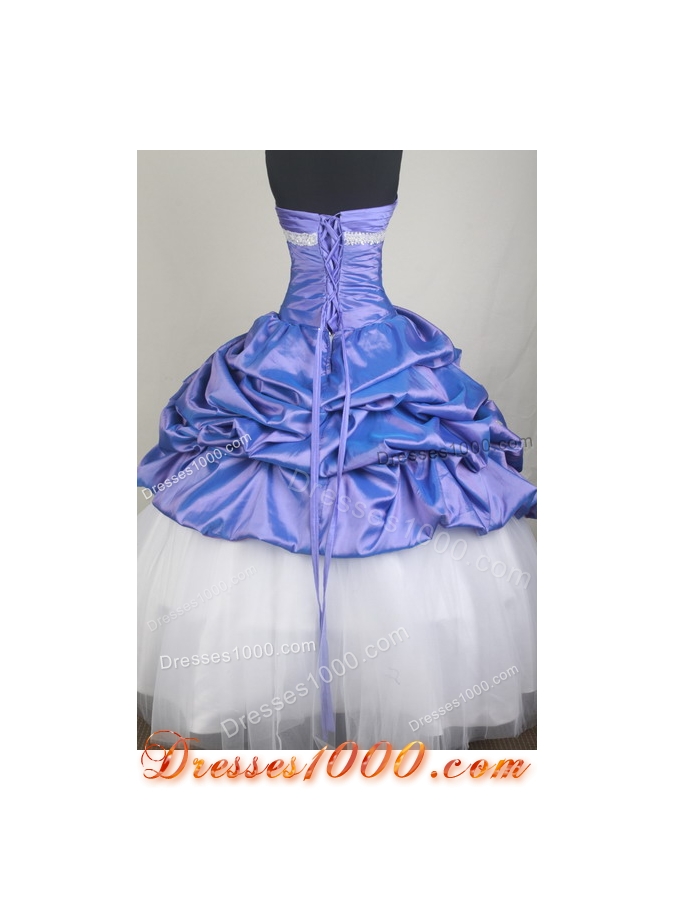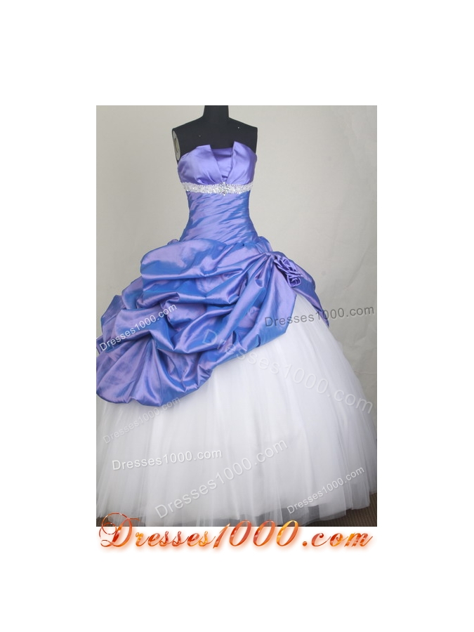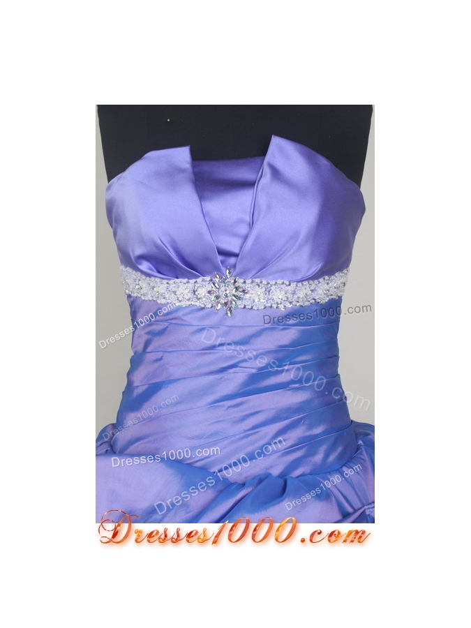 Dramatic and elegant, this cute ball gown dress is sure to make them stare. The strapless neckline is accented with contrasting and shimmering rhinestones below the bustline. The ruched fabric makes any waist looks slim. The full length, asymmetrical skirt covered by the main tone is gathered to show the contrasting layered petticoat.