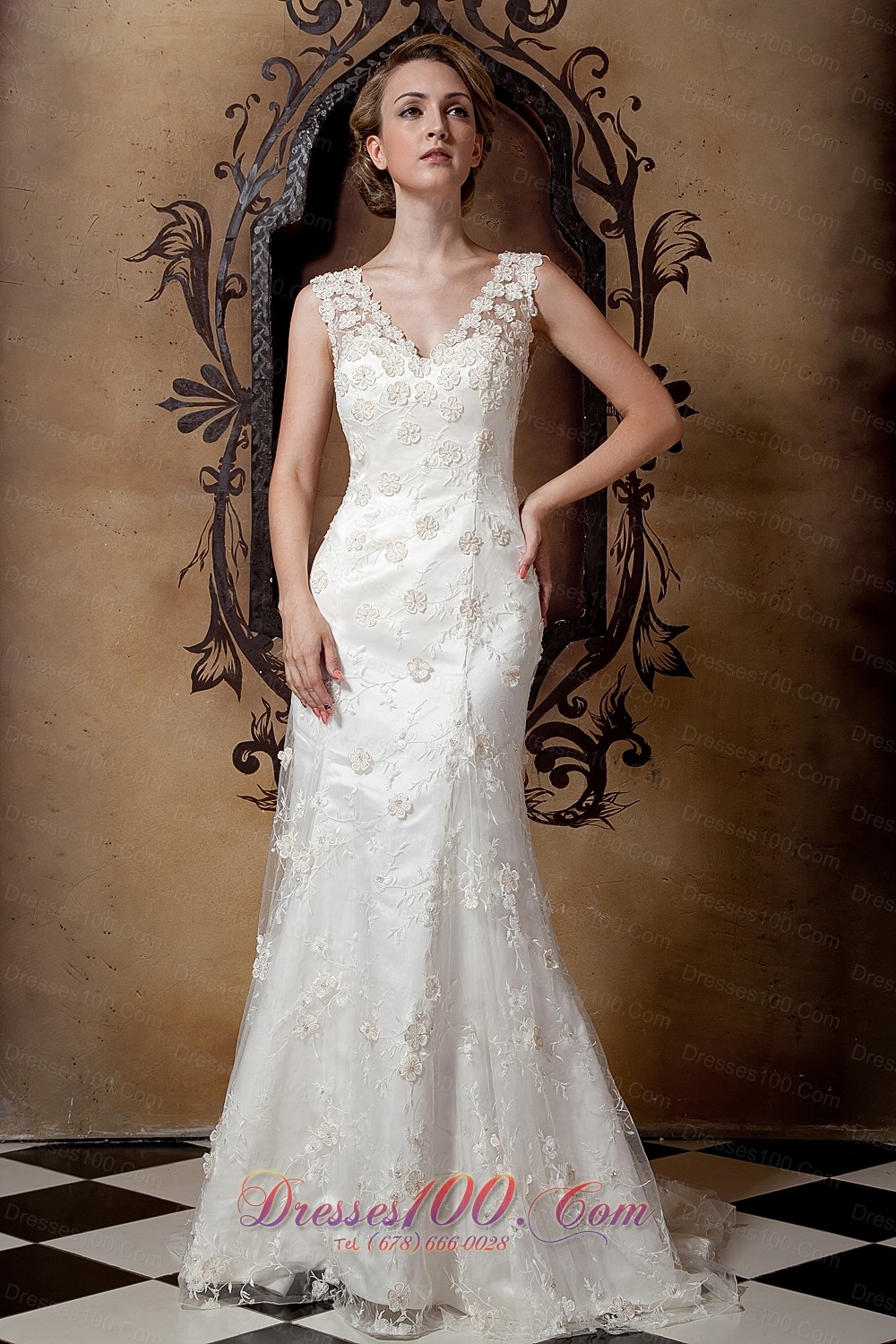 Lace V Neck Brush Train Taffeta Wedding Dresses