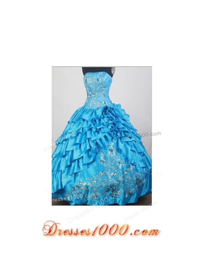 A gorgeous quinceanera gown. The strapless dress features stunning appliques with sparkling beading, asymmetrical tiers gathered a little at the hip. Similar appliques with beading accented at the bottom of the skirt to complete the look.
