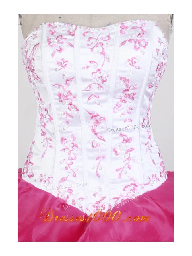 This fabulous quinceanera dress features a strapless sweetheart neckline accented with embroidered cascading on a corset bodice and ballgown skirt designed with cascading pick-ups. This gorgeous quinceanera dress is available in white and hot pink.