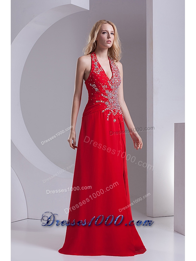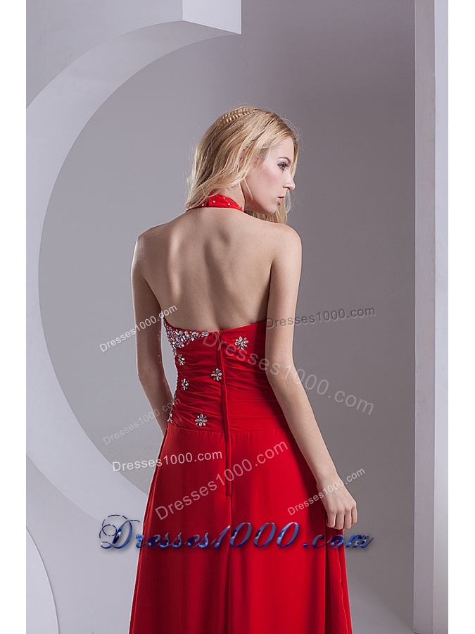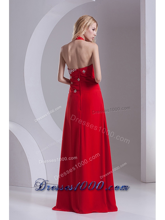 Column Halter Top Chiffon Beading Ruching Red Prom Dress