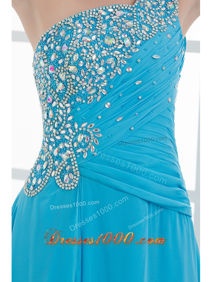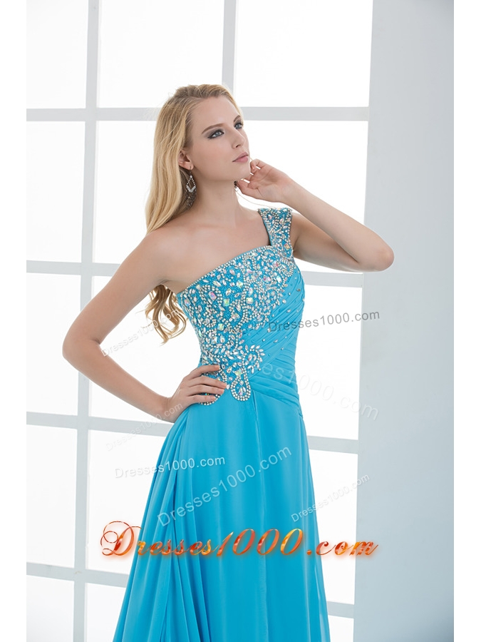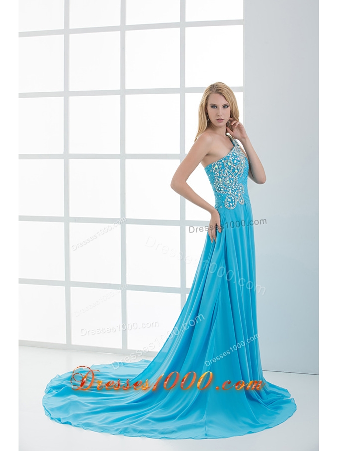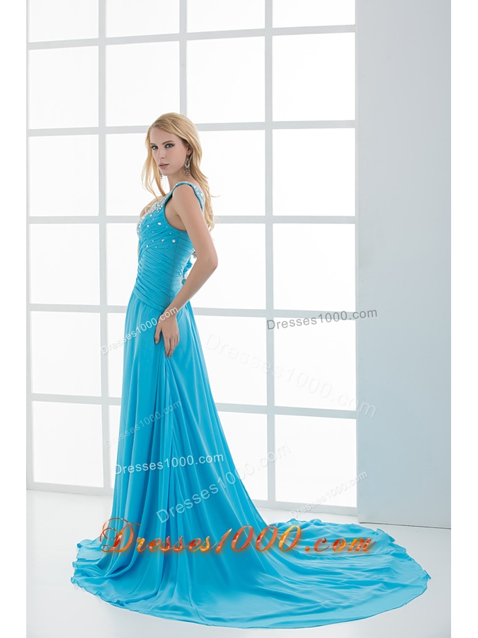 Sky Blue Beading and Ruching Empire One Shoulder Prom Dress with Court Train