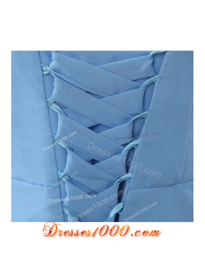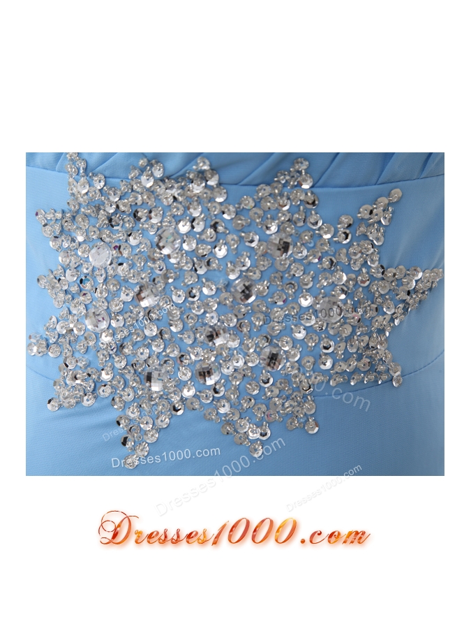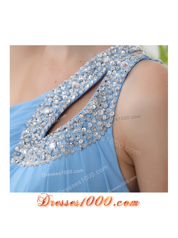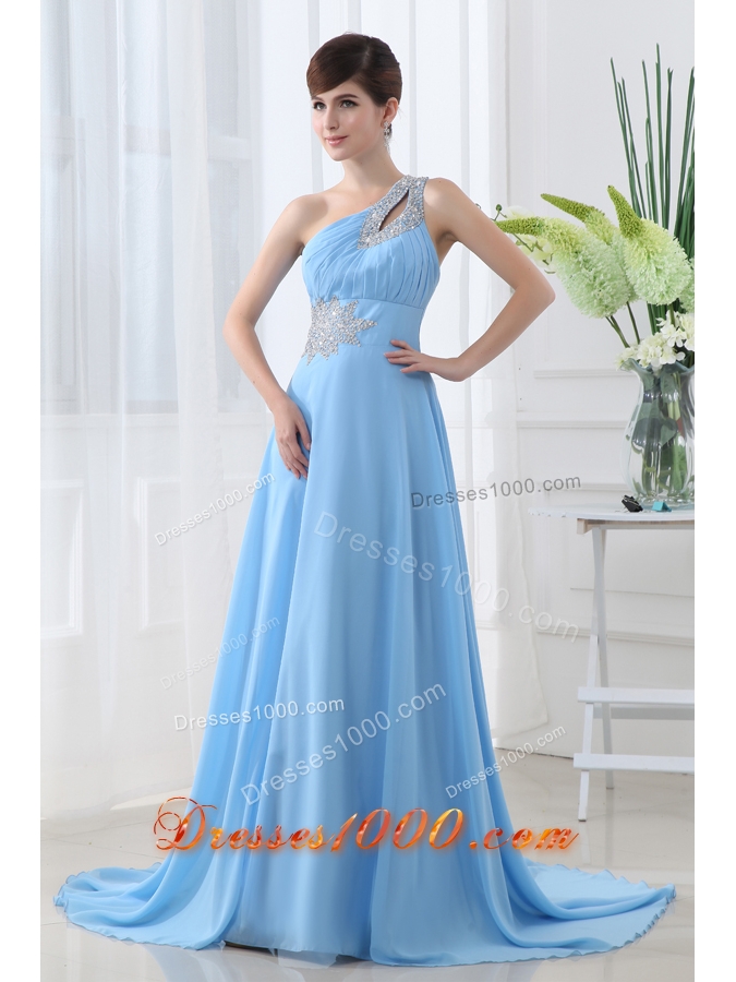 Aqua Blue One Shoulder Beading and Ruching Court Train Prom Dress