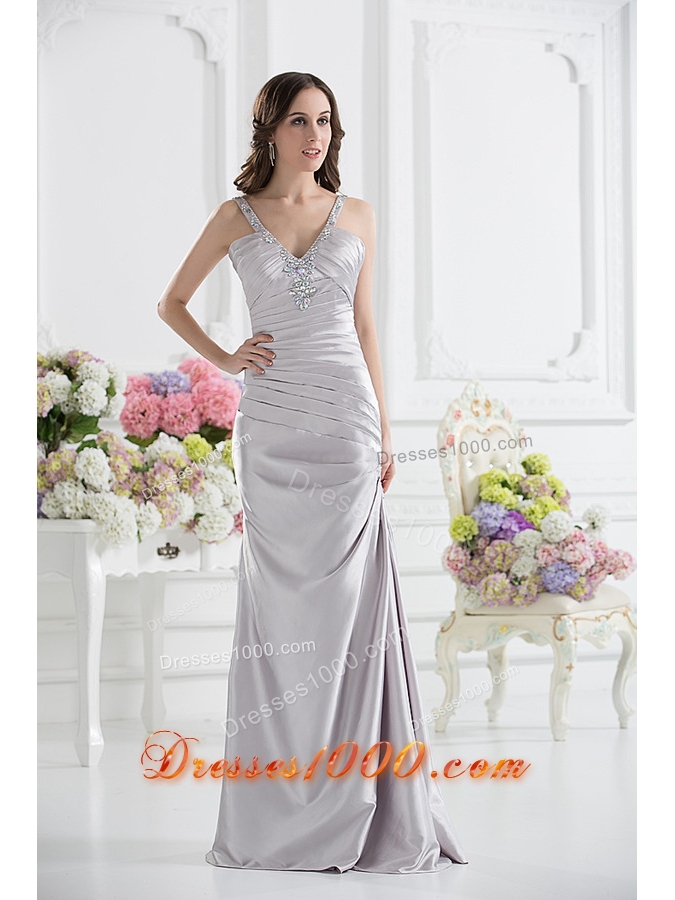 Silver Column V-neck Satin Prom Dress with Ruching and Beading