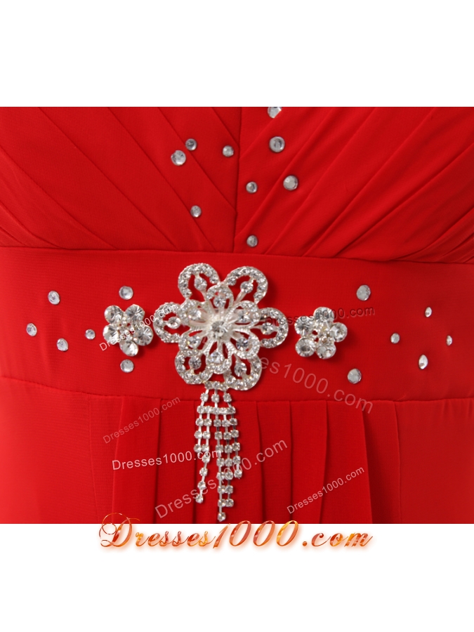 Red V-neck Beading and Ruching Floor-length Chiffon Prom Dress