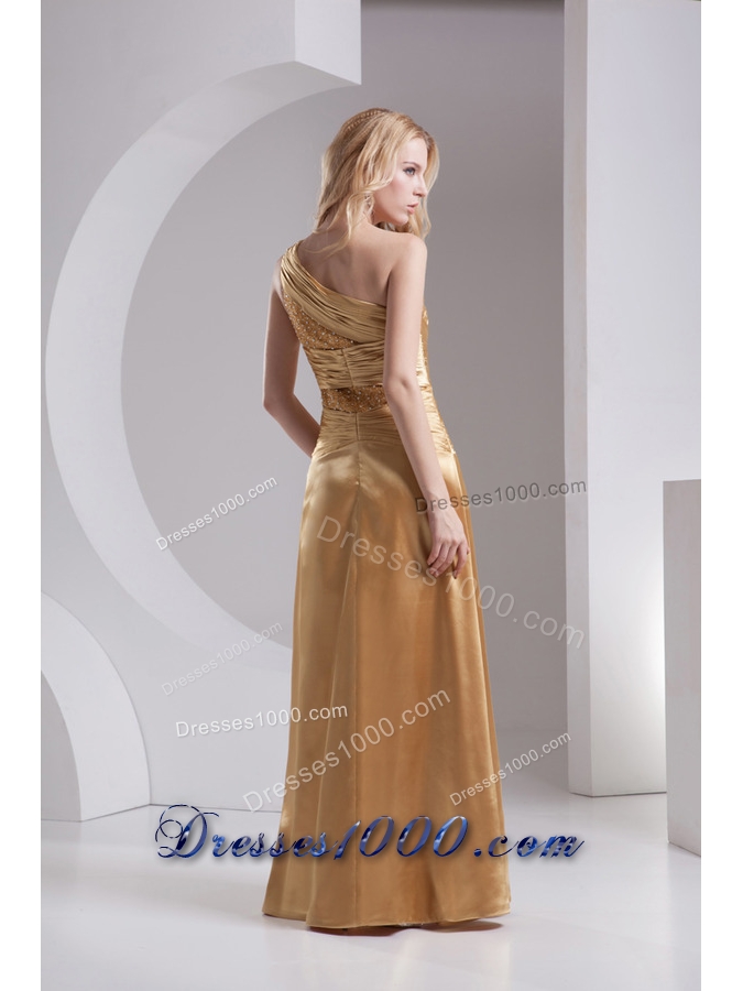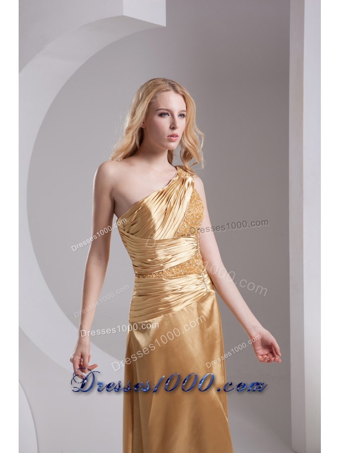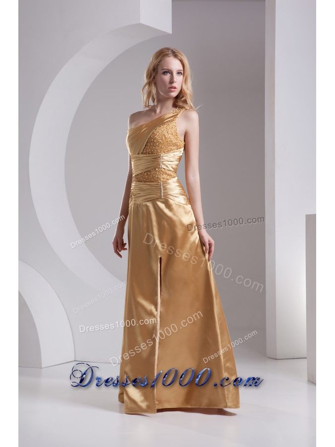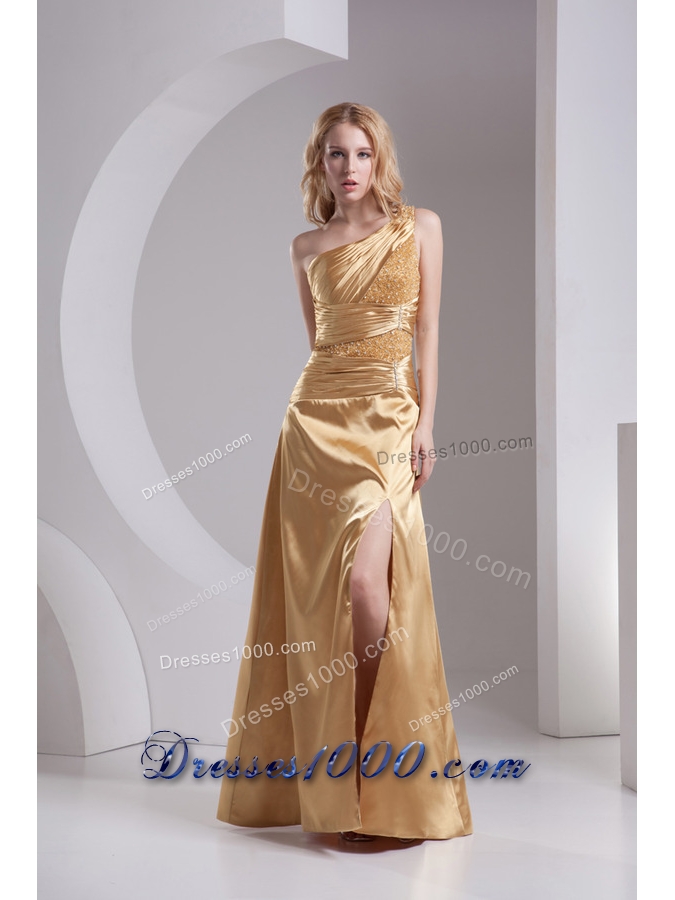 Column One Shoulder High Slit Beading Ruching Taffeta Prom Dress in Gold
