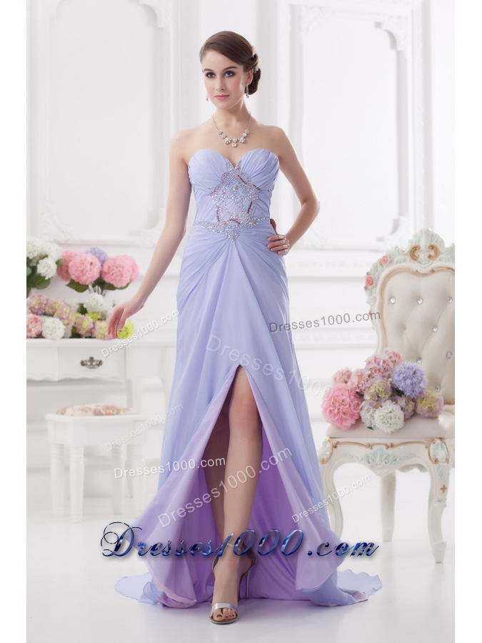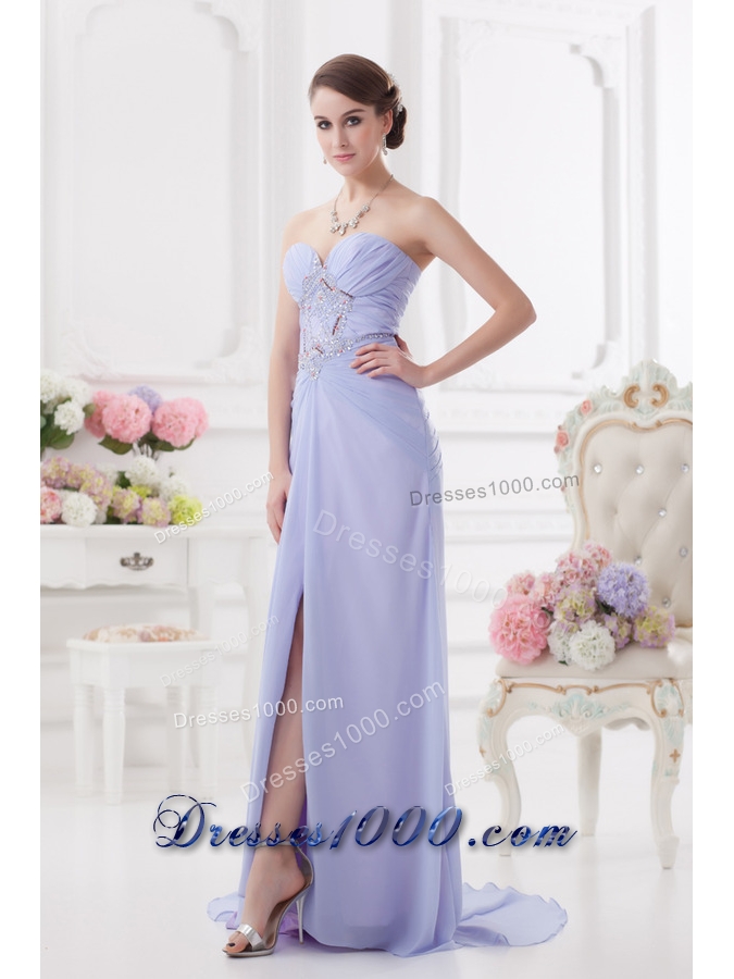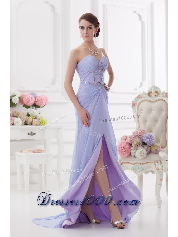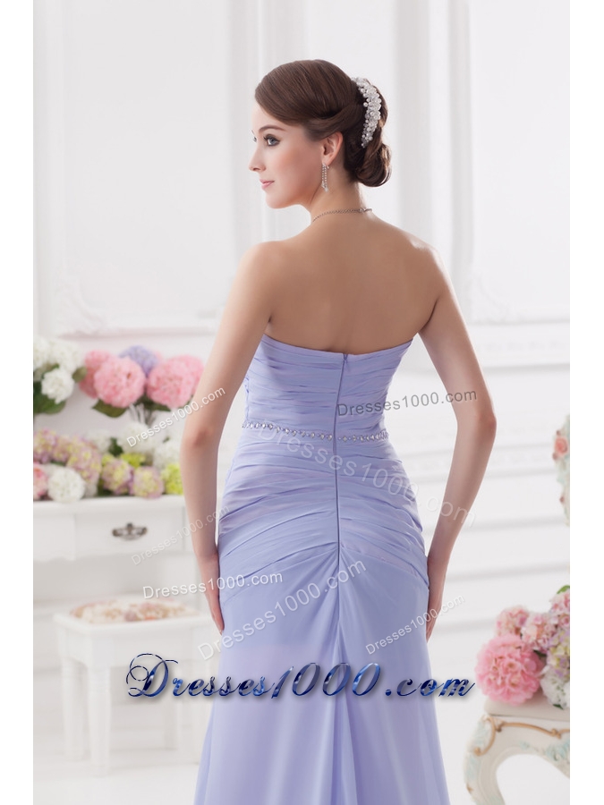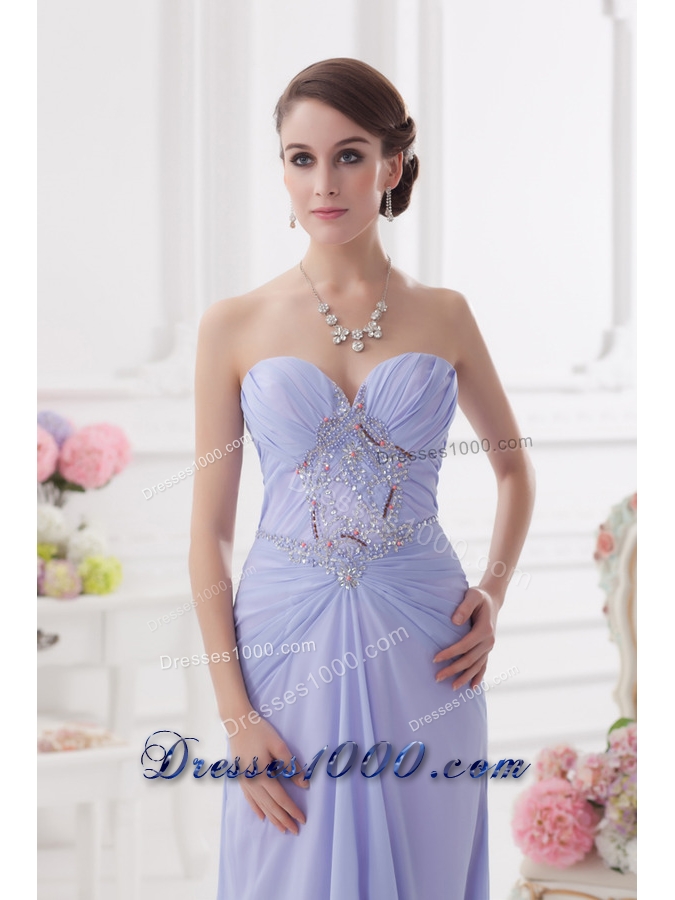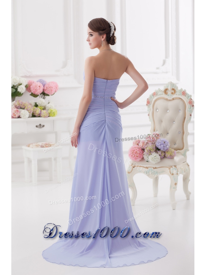 Sweetheart Brush Train Lavender Prom Dress with Ruching and Beading
