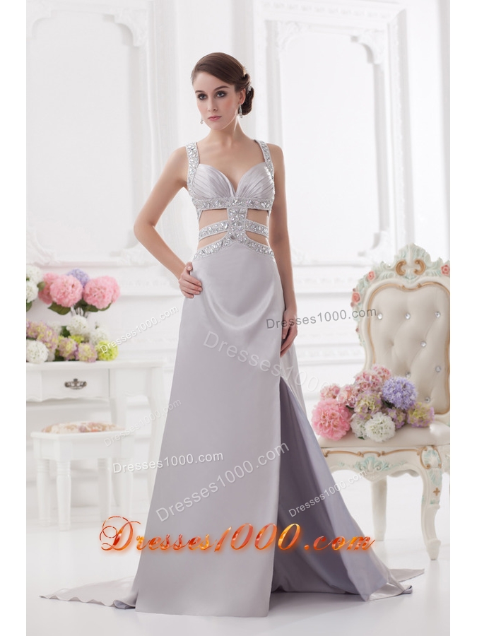 Straps High Slit Criss Cross Watteau Train Prom Dress in Light Grey