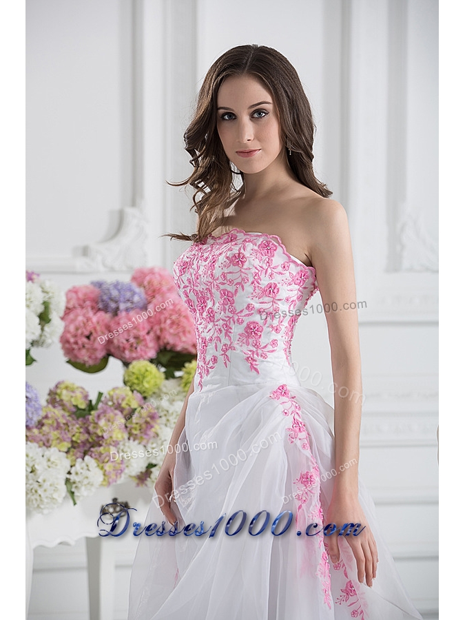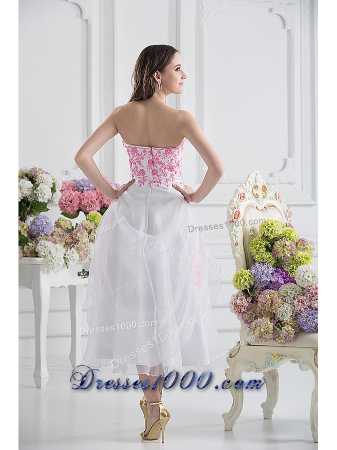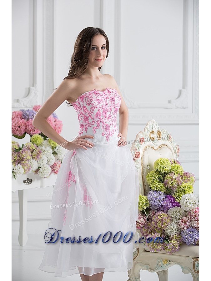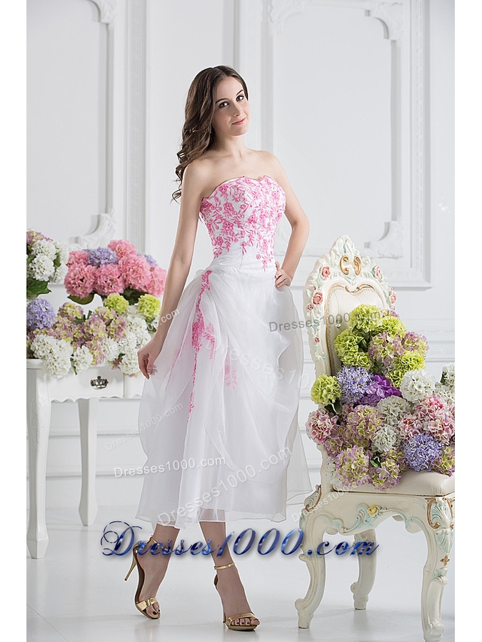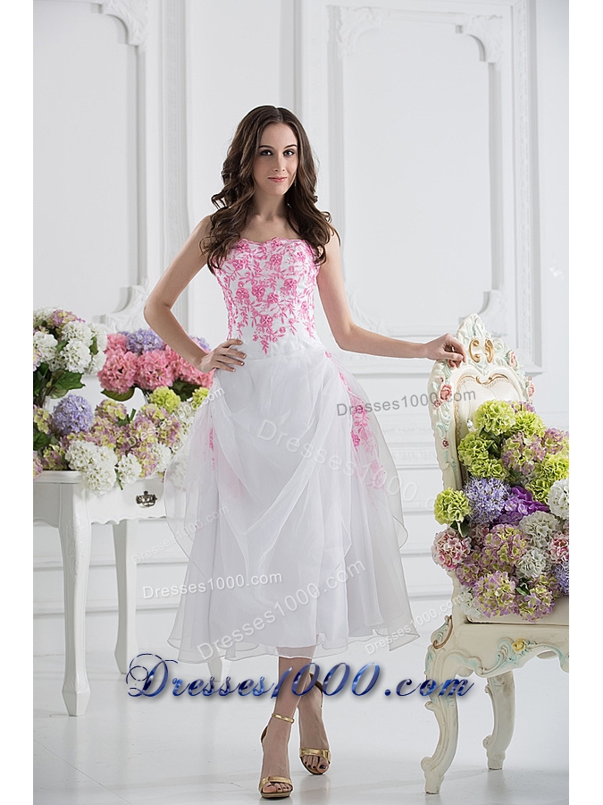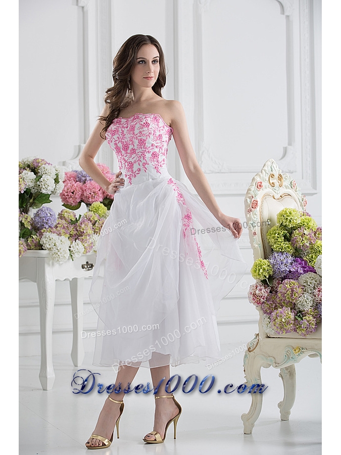 A-line Strapless White Organza Tea-length Prom Dress with Appliques