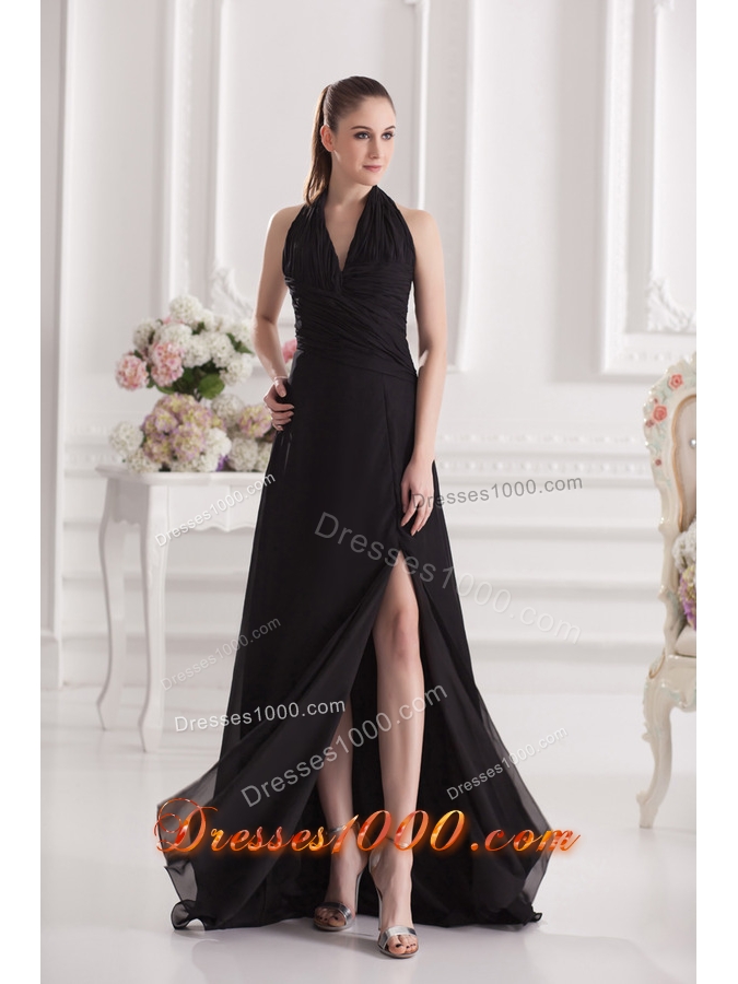 A-line Halter Top Floor-length Chiffon Black High Slit Prom Dress