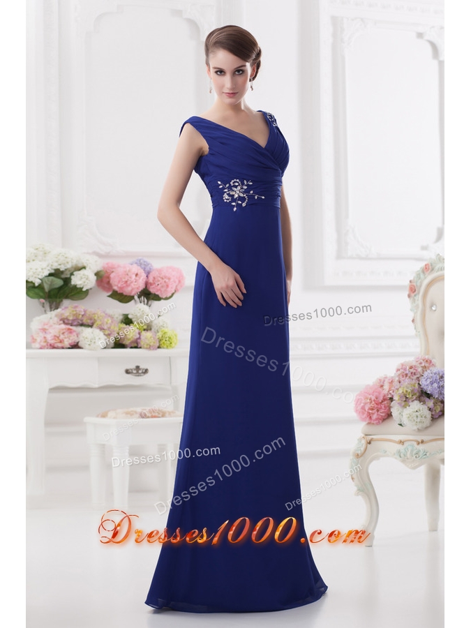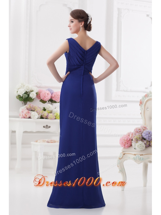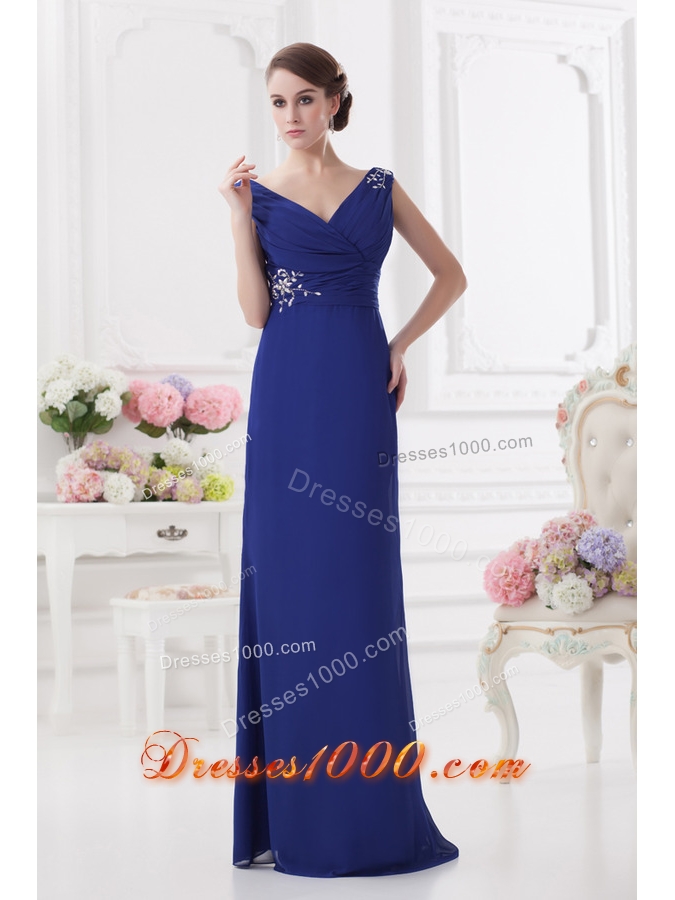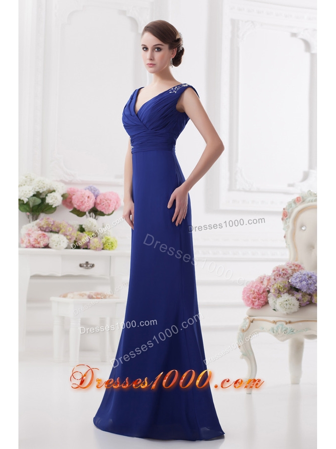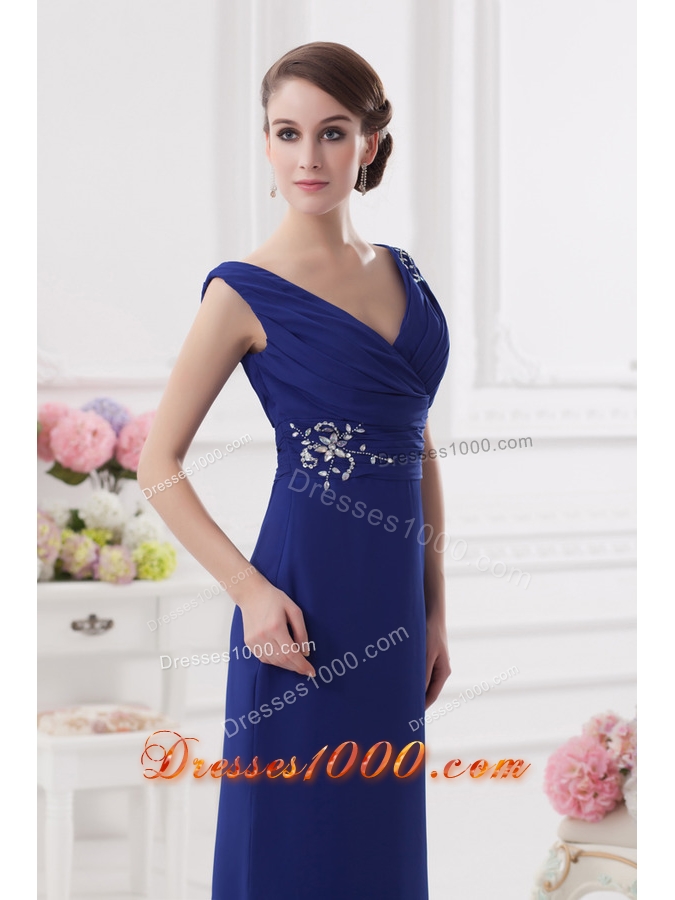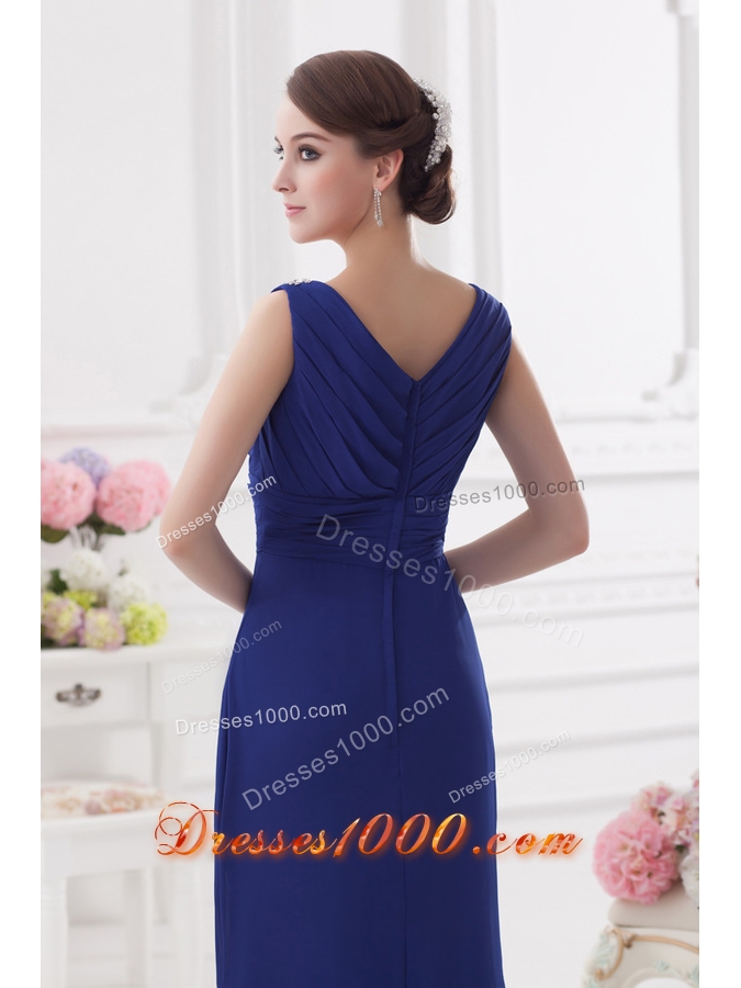 Ruching and Beading V-neck Column Dark Blue Prom Dress
