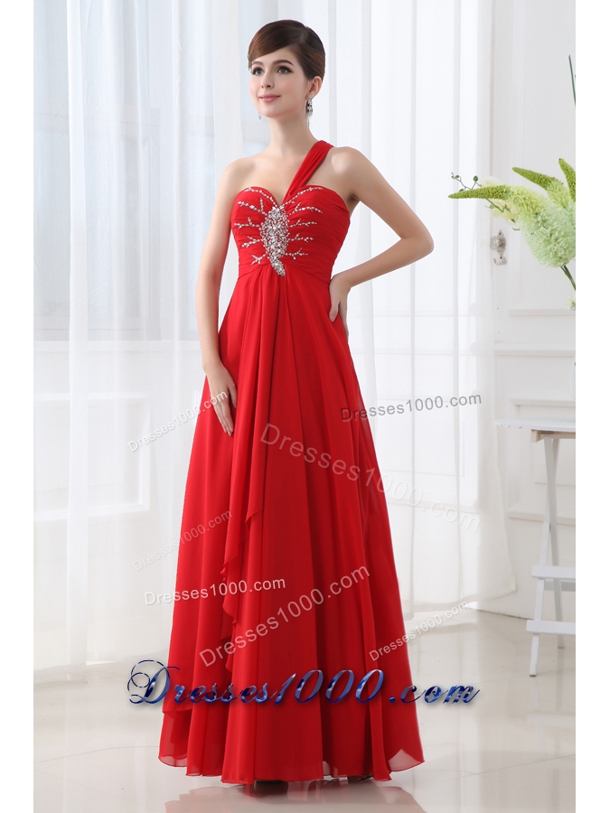Empire One Shoulder Beading and Ruching Long Red Prom Dress