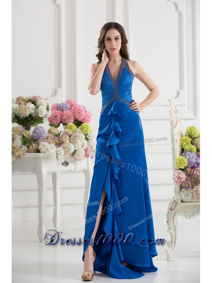 Column Blue Empire Halter Top Prom Dress with Beading and High Slit