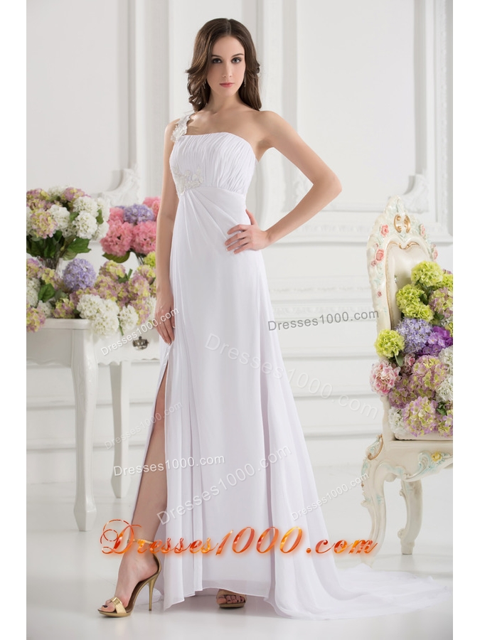 Empire White One Shoulder High Slit Brush Train Chiffon Prom Dress