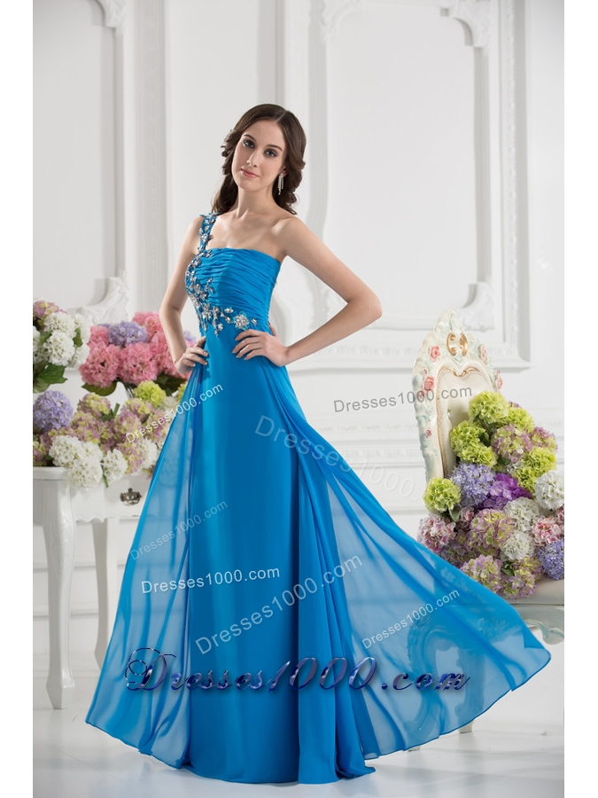 Empire One Shoulder Chiffon Appliques Ruching Dodger Blue Prom Dress