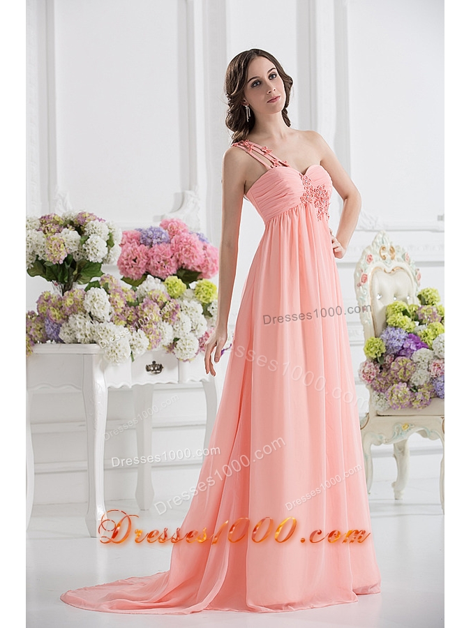 Peach Empire Brush Train Prom Dress with Ruching and Appliques