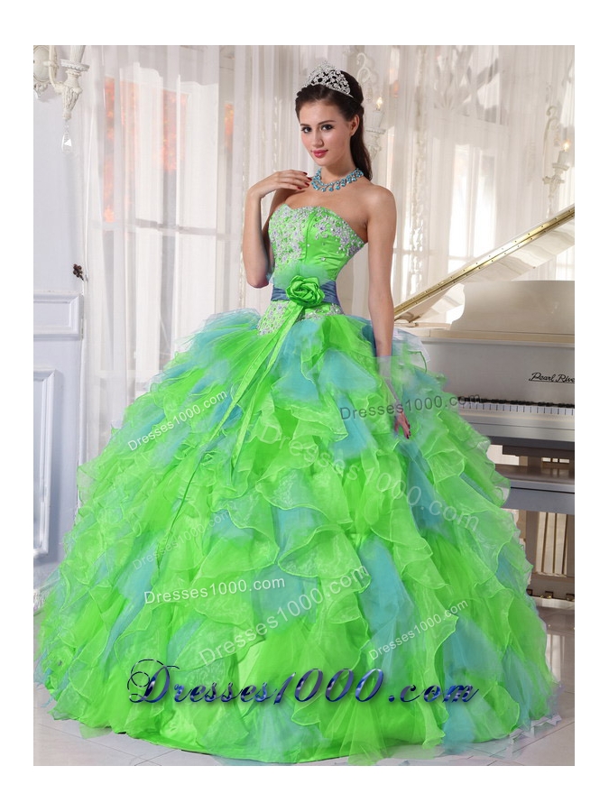 Spring Green and Blue Organza Appliques and Ruffles 2013 Quinceanera Dress