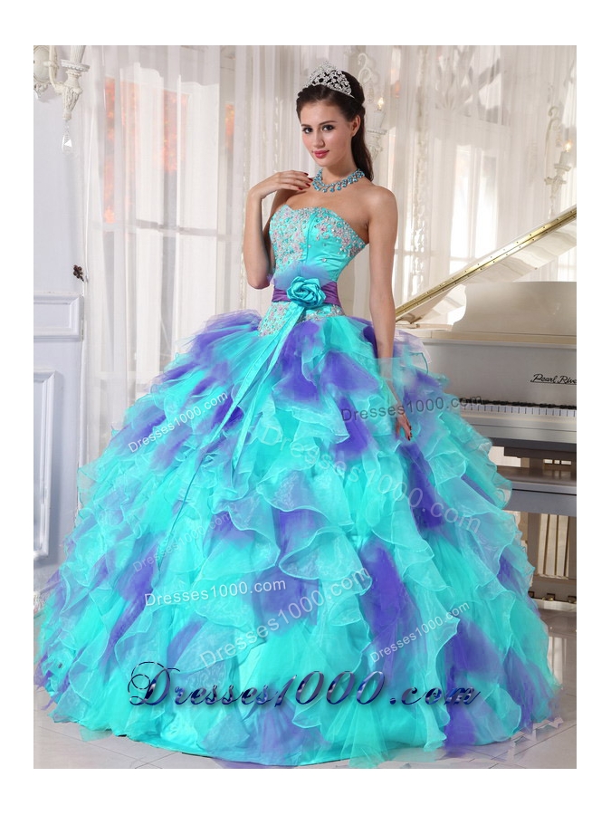 This gorgeous quinceanera ball gown features a fitted, strapless neckline accented with appliques in the bodice.The waist of this ruffled quinceanera dress was wrapped with ruched ribbons around waist which is decorated with a rosette flower.