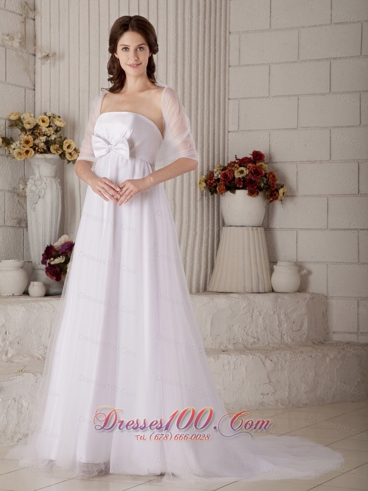 Cast a spell on the whole room by wearing this exquisite pure dress! The fitted, starpless bodice is decorated with a simple bowknot in the middle of the bust which will make you attract more attention. The floor-length skirt flows freely and covered with layers of tulle makes you like a princess! What is more, the see-through tulle made chic jacket can add more charming and grace for you. A sweep train and a zipper up back complete this gorgeous design. Don't hesitate!