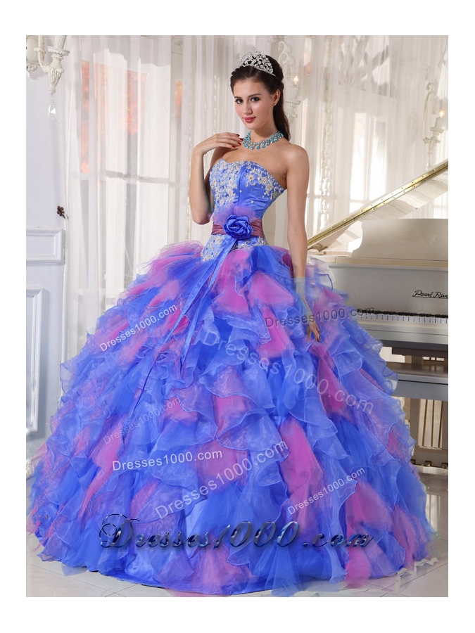 This gorgeous quinceanera ball gown features a fitted, strapless neckline accented with appliques in the bodice.The waist of this ruffled quinceanera dress was wrapped with ruched ribbons around waist which is decorated with a rosette flower.