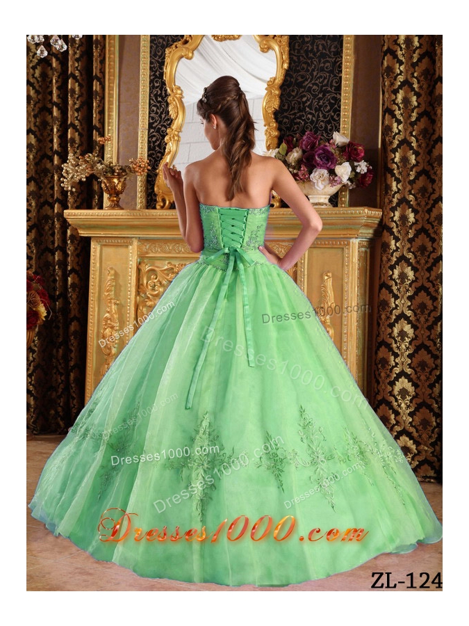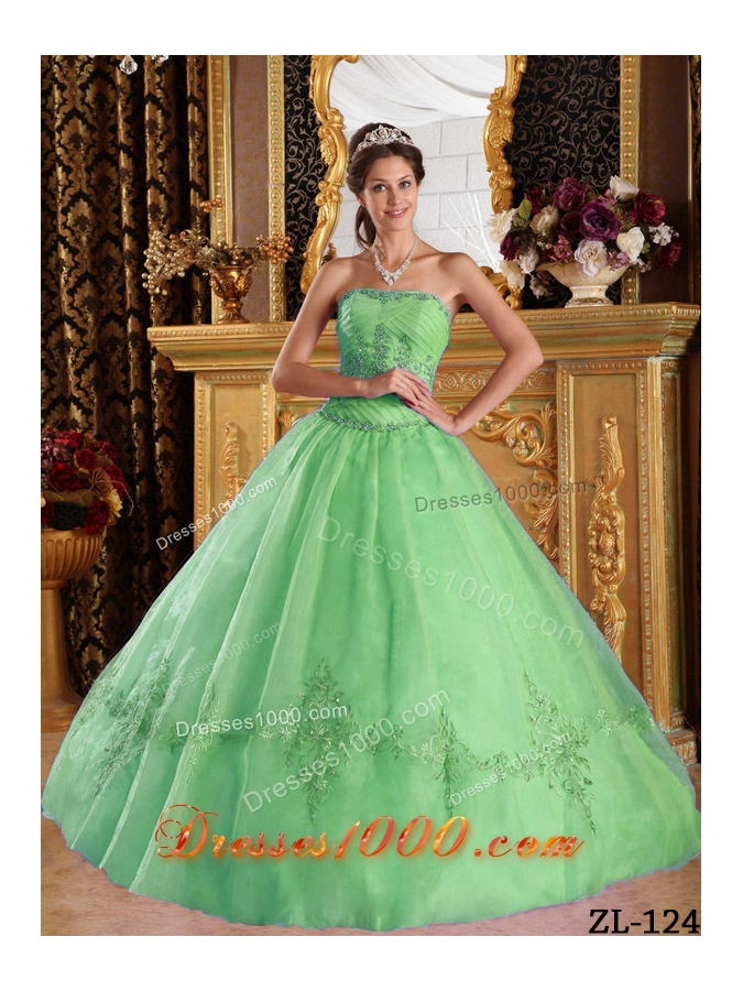 Cheap Green Ball Gown Strapless Appliques Tulle 2014 Quinceanera Dress
