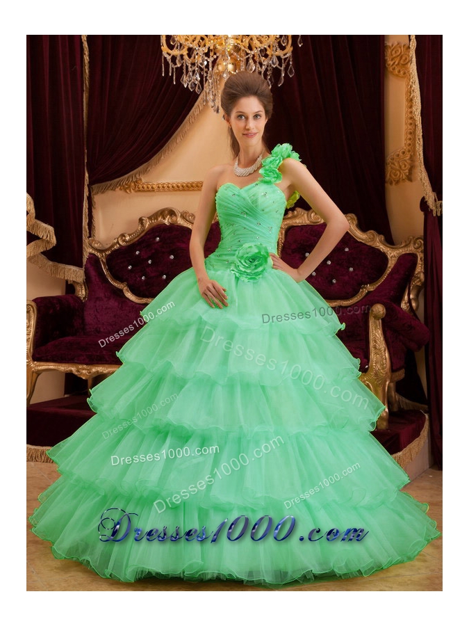 One Shoulder Quinceanera Dress in Apple Green Princess with Ruffles Layers and Hand Made Floor