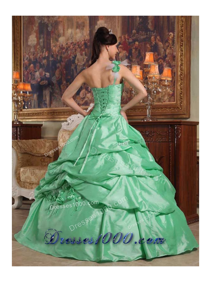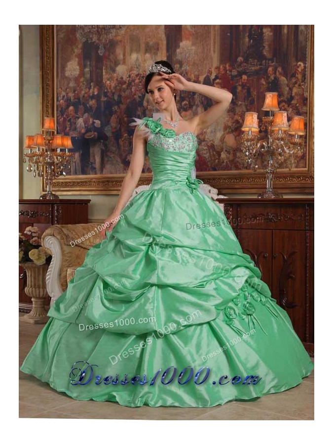 One Shoulder Quinceanera Dress in Apple Green Ball Gown with Hand Flowers