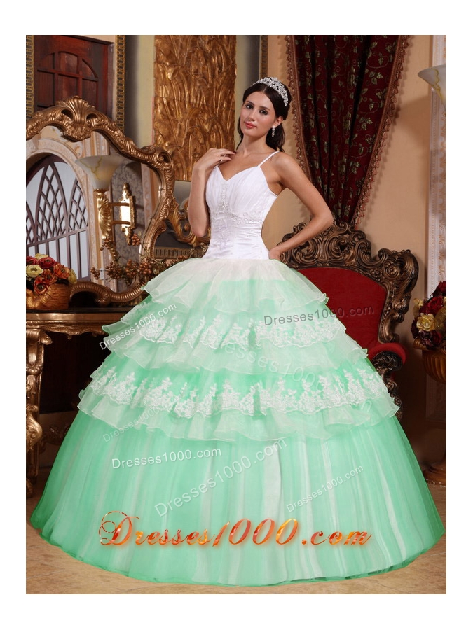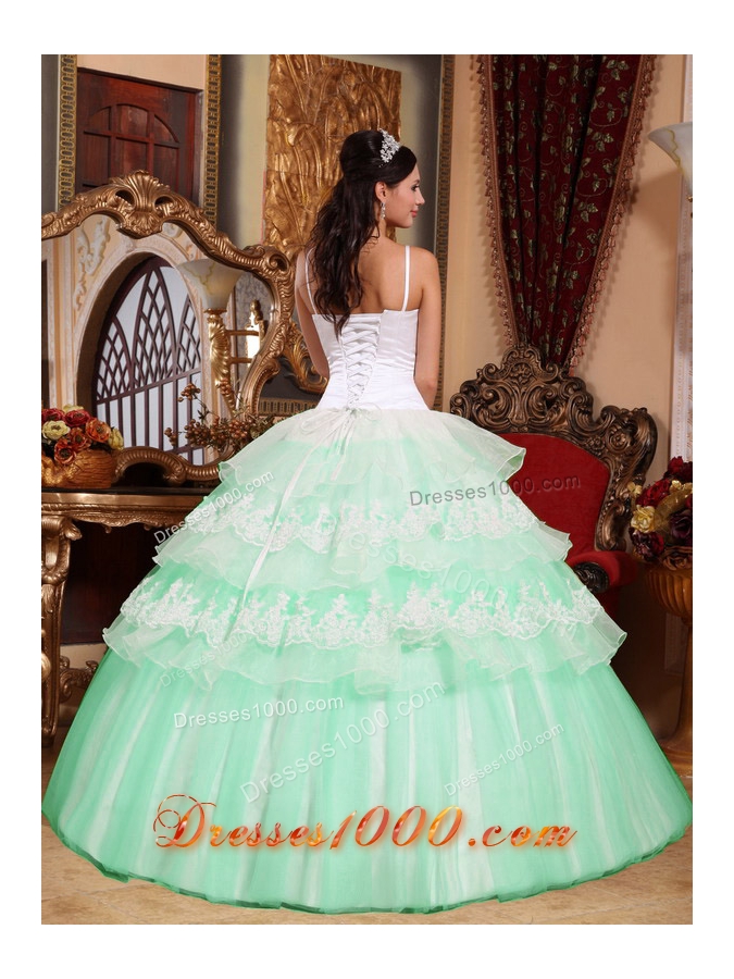 Quinceanera Dress in Apple Green Ball Gown Spaghetti Straps with Lace and Appliques
