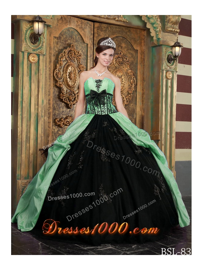 Affordable Apple Green Ball Gown Strapless with Appliques and Bow Quinceanera Dress
