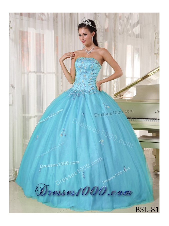 Aqua Blue Strapless Floor-length Taffeta and Tulle Quinceanera Dress with Appliques