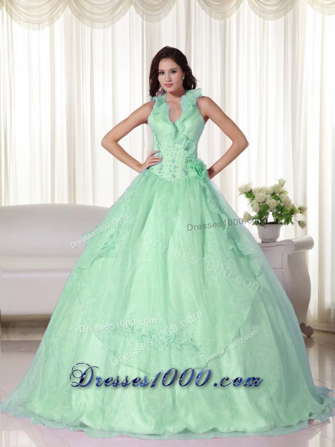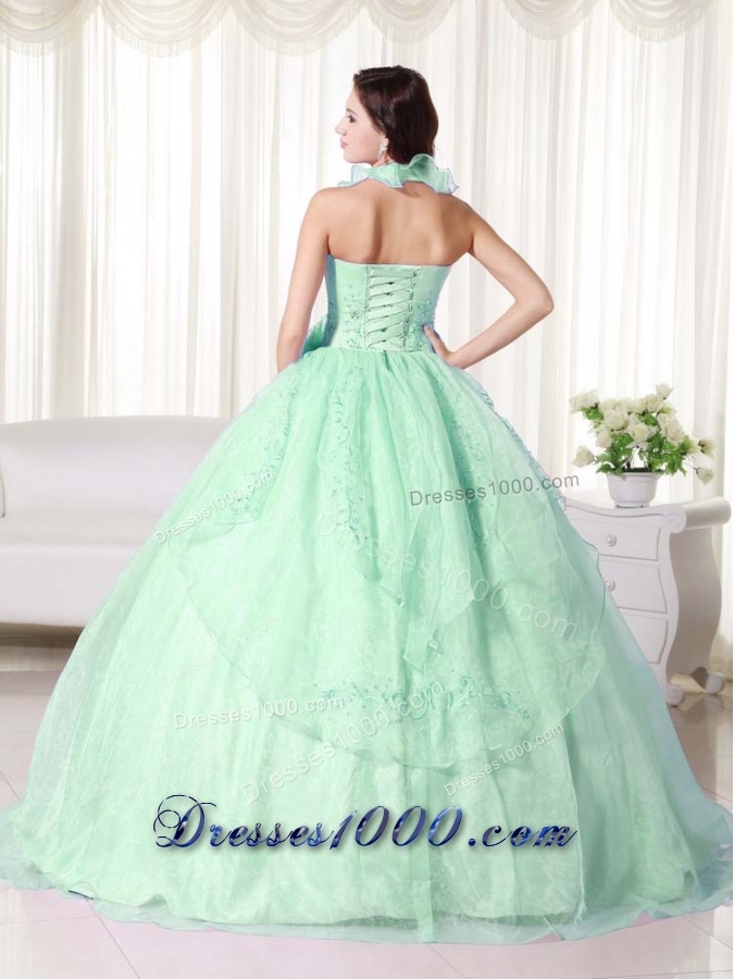 2014 Popular Apple Green Ball Gown Halter Embroidery Quinceanera Dress with Beading