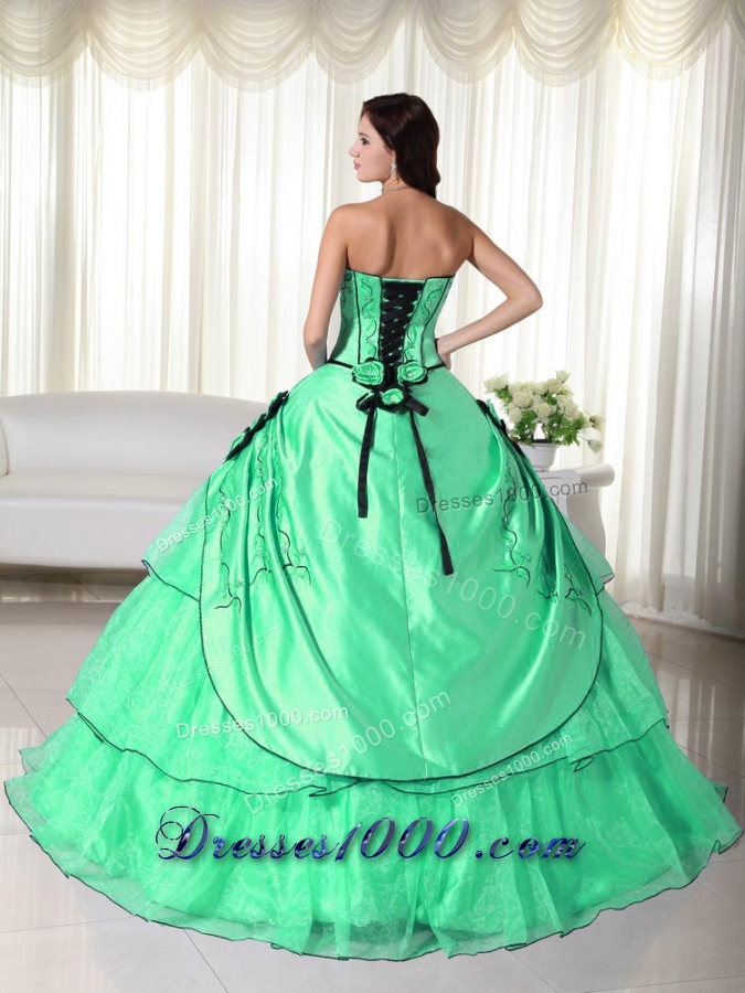 If you're a fan of the fancier, finer things in life – this might just be the dress for you. It features a gorgeous strapless bodice with embroidery embellishments, a sweetheart neckline and three hand-made flowers on both side with more shimmery beading in the center of the flower which make the dress more dazzling. Also there are flowers on the back and lace up back finishes the look of this elegant dress.