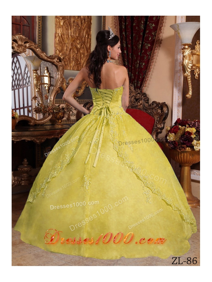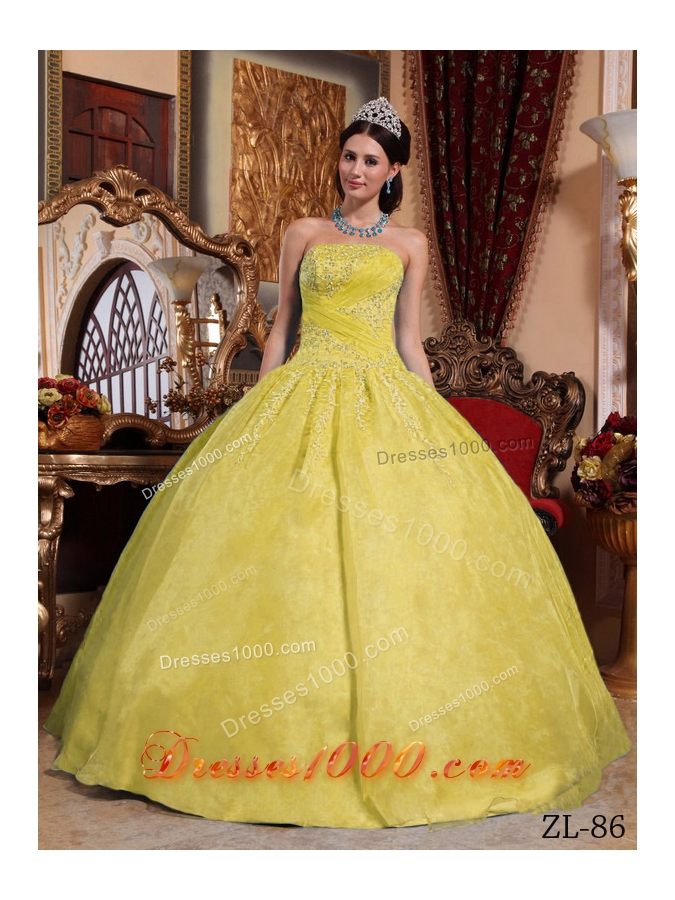 Cheap Strapless Organza Appliques Yellow Puffy Quinceanera Gown
