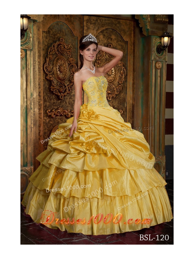 Strapless Beading and Hand Made Flowers Yellow Quinceanera Gown Dresses
